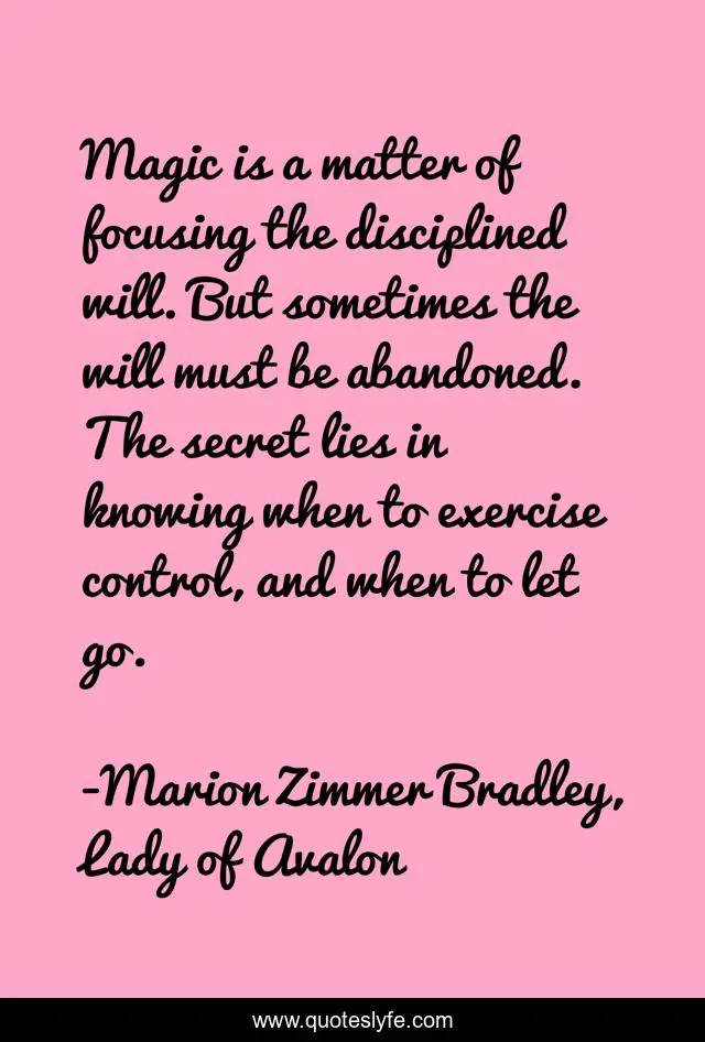 This page presents the quote "Magic is a matter of focusing the disciplined will. But sometimes the will must be abandoned. The secret lies in knowing when to exercise control, and when to let go.". Author of this quote is Marion Zimmer Bradley, Lady of Avalon. This quote is about magic, arthurian,.