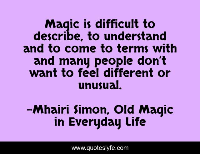 This page presents the quote "Magic is difficult to describe, to understand and to come to terms with and many people don’t want to feel different or unusual.". Author of this quote is Mhairi Simon, Old Magic in Everyday Life. .