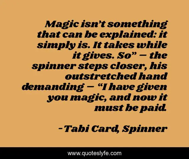 This page presents the quote "Magic isn’t something that can be explained: it simply is. It takes while it gives. So” – the spinner steps closer, his outstretched hand demanding – “I have given you magic, and now it must be paid.". Author of this quote is Tabi Card, Spinner. This quote is about spinner, rumpelstiltskin, magic, fairy-tale,.