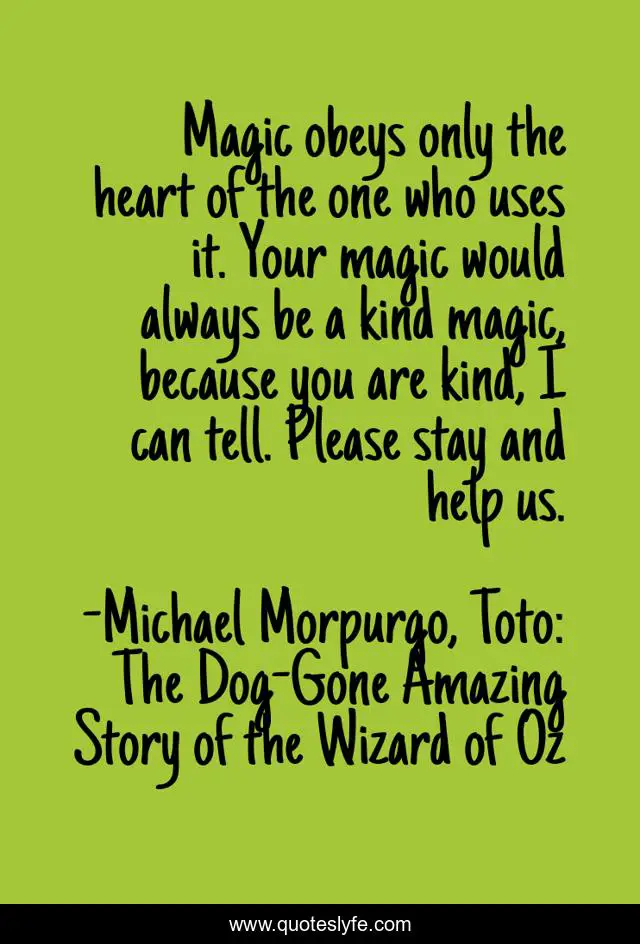 This page presents the quote "Magic obeys only the heart of the one who uses it. Your magic would always be a kind magic, because you are kind, I can tell. Please stay and help us.". Author of this quote is Michael Morpurgo, Toto: The Dog-Gone Amazing Story of the Wizard of Oz. This quote is about status-of-the-heart, kindness, magic,.