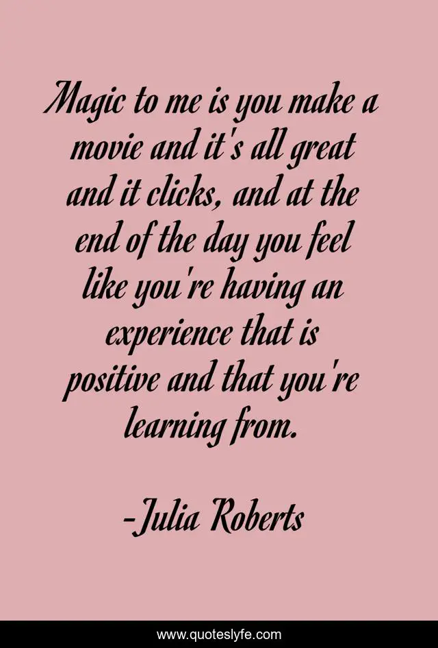 This page presents the quote "Magic to me is you make a movie and it's all great and it clicks, and at the end of the day you feel like you're having an experience that is positive and that you're learning from.". Author of this quote is Julia Roberts. This quote is about great, learning, experience,.