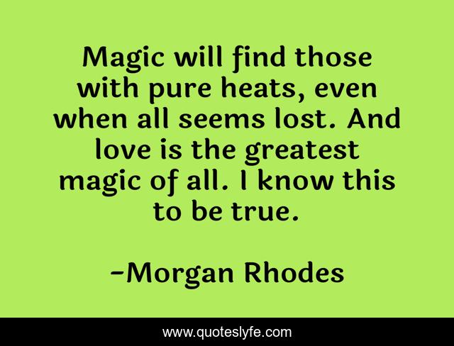 This page presents the quote "Magic will find those with pure heats, even when all seems lost. And love is the greatest magic of all. I know this to be true.". Author of this quote is Morgan Rhodes. This quote is about love, magic, affection,.
