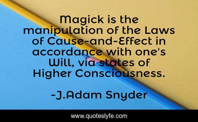 This page presents the quote "Magick is the manipulation of the Laws of Cause-and-Effect in accordance with one's Will, via states of Higher Consciousness.". Author of this quote is J.Adam Snyder. This quote is about occult, consciousness, esoteric, magick, cause-and-effect, occult-science, laws, metaphysics, j-adam-snyder,.