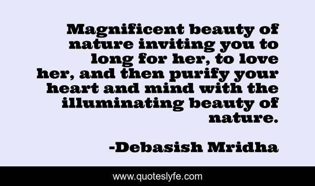 This page presents the quote "Magnificent beauty of nature inviting you to long for her, to love her, and then purify your heart and mind with the illuminating beauty of nature.". Author of this quote is Debasish Mridha. This quote is about life, love, knowledge, inspirational, intelligence, philosophy, wisdom, quotes, affection,.