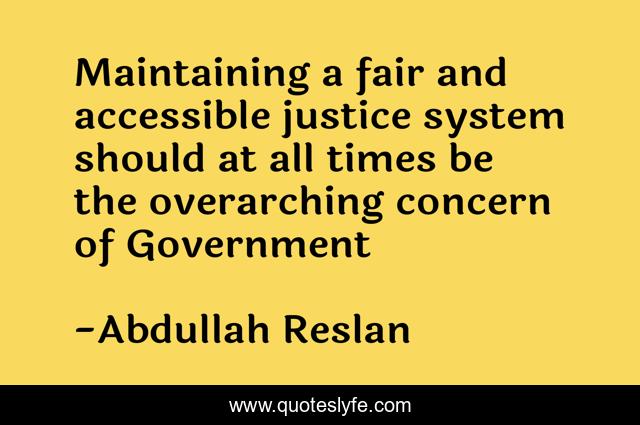 This page presents the quote "Maintaining a fair and accessible justice system should at all times be the overarching concern of Government". Author of this quote is Abdullah Reslan. This quote is about justice, law, community, courts, government,.