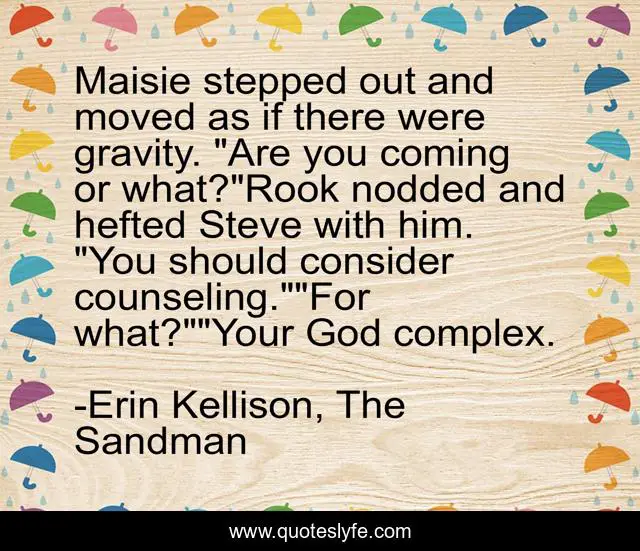 This page presents the quote "Maisie stepped out and moved as if there were gravity. "Are you coming or what?"Rook nodded and hefted Steve with him. "You should consider counseling.""For what?""Your God complex.". Author of this quote is Erin Kellison, The Sandman. This quote is about urban-fantasy, paranormal,.