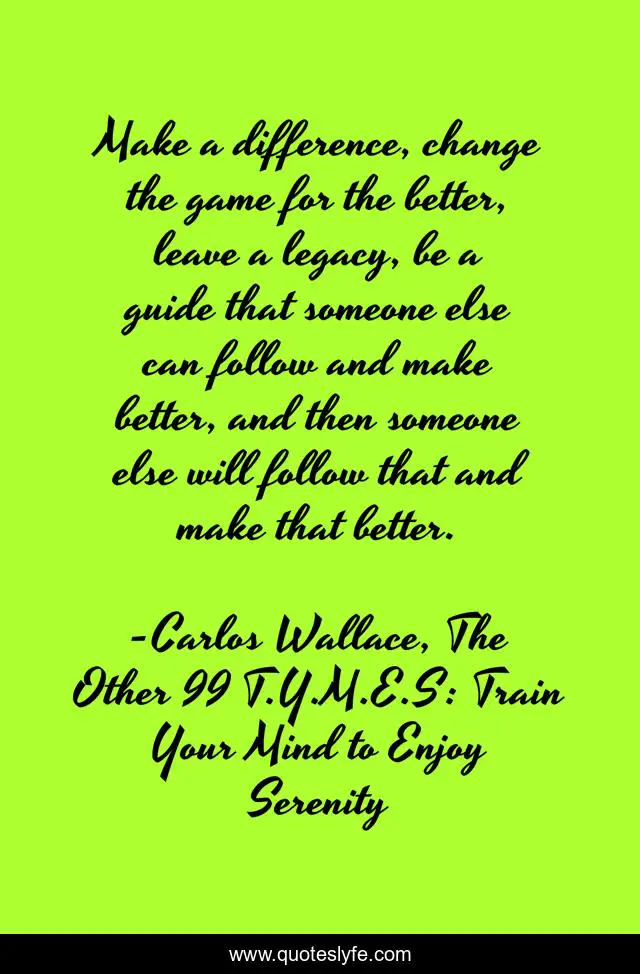 "Carlos Wallace, The Other 99 T.Y.M.E.S: Train Your Mind to Enjoy Serenity Quotes." Quoteslyfe.com, 2025. Fri. 05 Dec. 2025. <https://www.quoteslyfe.com/quote/Make-a-difference-change-the-game-for-64012>.