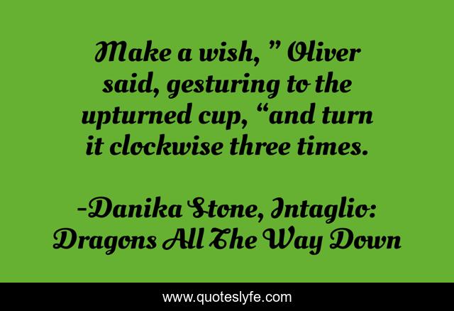 This page presents the quote "Make a wish, ” Oliver said, gesturing to the upturned cup, “and turn it clockwise three times.". Author of this quote is Danika Stone, Intaglio: Dragons All The Way Down. This quote is about wishes, fortune-telling, tea-cup-reading,.