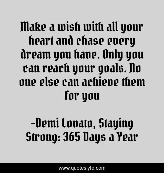 This page presents the quote "Make a wish with all your heart and chase every dream you have. Only you can reach your goals. No one else can achieve them for you". Author of this quote is Demi Lovato, Staying Strong: 365 Days a Year. This quote is about heart, goal, dreams,.