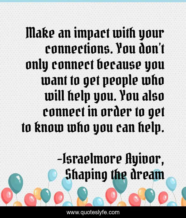 "Israelmore Ayivor, Shaping the dream Quotes." Quoteslyfe.com, 2025. Sat. 06 Dec. 2025. <https://www.quoteslyfe.com/quote/Make-an-impact-with-your-connections-You-120564>.