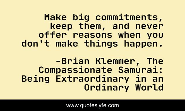 This page presents the quote "Make big commitments, keep them, and never offer reasons when you don't make things happen.". Author of this quote is Brian Klemmer, The Compassionate Samurai: Being Extraordinary in an Ordinary World. .