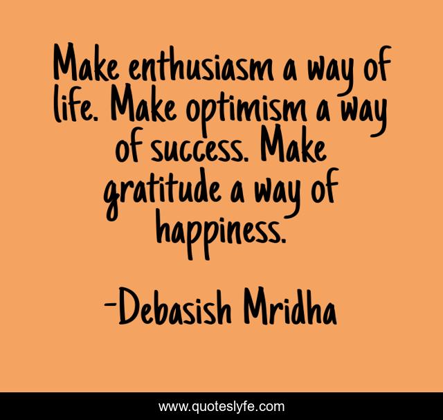 This page presents the quote "Make enthusiasm a way of life. Make optimism a way of success. Make gratitude a way of happiness.". Author of this quote is Debasish Mridha. This quote is about life, love, knowledge, inspirational, intelligence, philosophy, wisdom, quotes, affection,.