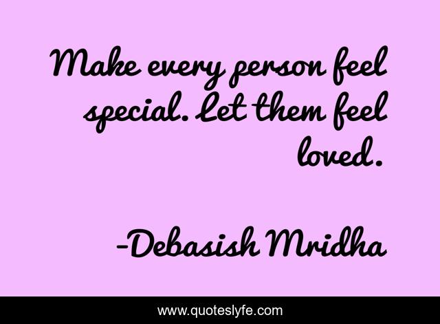 This page presents the quote "Make every person feel special. Let them feel loved.". Author of this quote is Debasish Mridha. This quote is about philosophy, debasish-mridha, quotes, inspirational, enthusiasm, feel-loved, feel-special, debasish-mridha-m-d,.