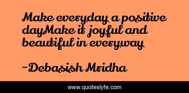 This page presents the quote "Make everyday a positive dayMake it joyful and beautiful in everyway". Author of this quote is Debasish Mridha. This quote is about beautiful, life, debasish, mridha, philosophy, confidence, day, positive, joyful,.