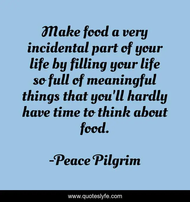 This page presents the quote "Make food a very incidental part of your life by filling your life so full of meaningful things that you'll hardly have time to think about food.". Author of this quote is Peace Pilgrim. This quote is about life, meaningful, time,.