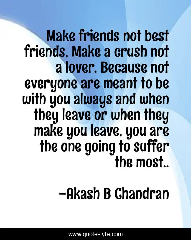 This page presents the quote "Make friends not best friends, Make a crush not a lover, Because not everyone are meant to be with you always and when they leave or when they make you leave, you are the one going to suffer the most..". Author of this quote is Akash B Chandran. This quote is about crush, life, hurt, friends, lover,.