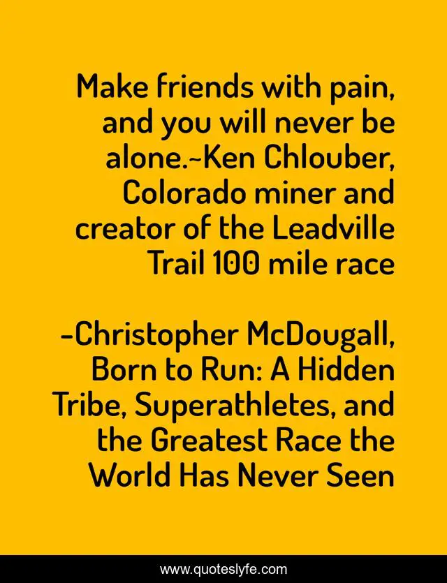 This page presents the quote "Make friends with pain, and you will never be alone.~Ken Chlouber, Colorado miner and creator of the Leadville Trail 100 mile race". Author of this quote is Christopher McDougall, Born to Run: A Hidden Tribe, Superathletes, and the Greatest Race the World Has Never Seen. .