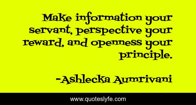 This page presents the quote "Make information your servant, perspective your reward, and openness your principle.". Author of this quote is Ashlecka Aumrivani. This quote is about information, perspective, inspirational, enthusiasm,.