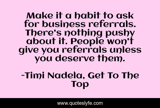 This page presents the quote "Make it a habit to ask for business referrals. There's nothing pushy about it. People won't give you referrals unless you deserve them.". Author of this quote is Timi Nadela, Get To The Top. .