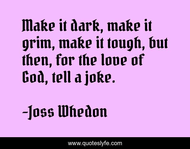 This page presents the quote "Make it dark, make it grim, make it tough, but then, for the love of God, tell a joke.". Author of this quote is Joss Whedon. This quote is about humour, joke, writing, dark, stories, perspective,.