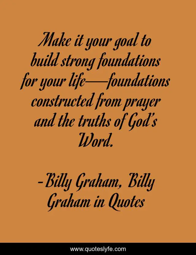 This page presents the quote "Make it your goal to build strong foundations for your life—foundations constructed from prayer and the truths of God’s Word.". Author of this quote is Billy Graham, Billy Graham in Quotes. This quote is about life, billy-graham,.