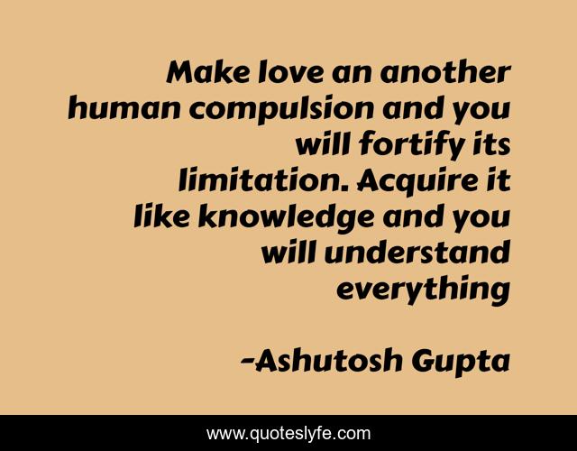 This page presents the quote "Make love an another human compulsion and you will fortify its limitation. Acquire it like knowledge and you will understand everything". Author of this quote is Ashutosh Gupta. This quote is about philosophy-of-life, wisdom,.