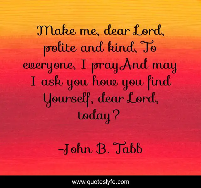 This page presents the quote "Make me, dear Lord, polite and kind, To everyone, I pray.And may I ask you how you find Yourself, dear Lord, today?". Author of this quote is John B. Tabb. This quote is about poetry, prayer,.
