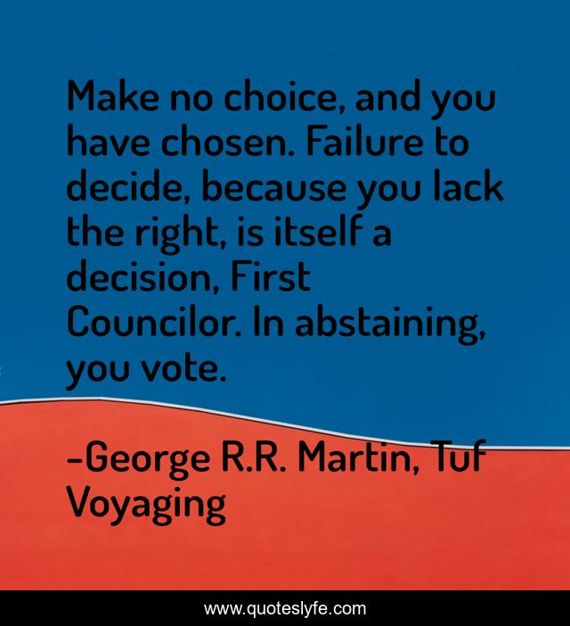 This page presents the quote "Make no choice, and you have chosen. Failure to decide, because you lack the right, is itself a decision, First Councilor. In abstaining, you vote.". Author of this quote is George R.R. Martin, Tuf Voyaging. This quote is about totalitarianism, choice,.