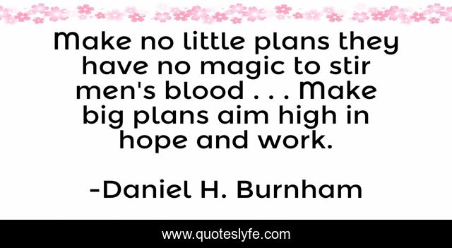 This page presents the quote "Make no little plans they have no magic to stir men's blood . . . Make big plans aim high in hope and work.". Author of this quote is Daniel H. Burnham. This quote is about goals, ambition,.