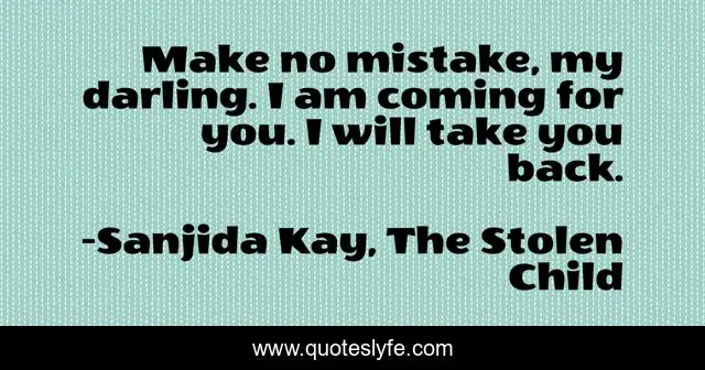 This page presents the quote "Make no mistake, my darling. I am coming for you. I will take you back.". Author of this quote is Sanjida Kay, The Stolen Child. This quote is about sanjida-kay, the-stolen-child, atlantic-books, crime, suspense, psychological-thriller, thriller,.