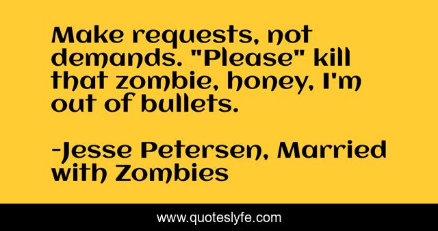 This page presents the quote "Make requests, not demands. "Please" kill that zombie, honey, I'm out of bullets.". Author of this quote is Jesse Petersen, Married with Zombies. This quote is about comedy, zombies, married-with-zombies,.