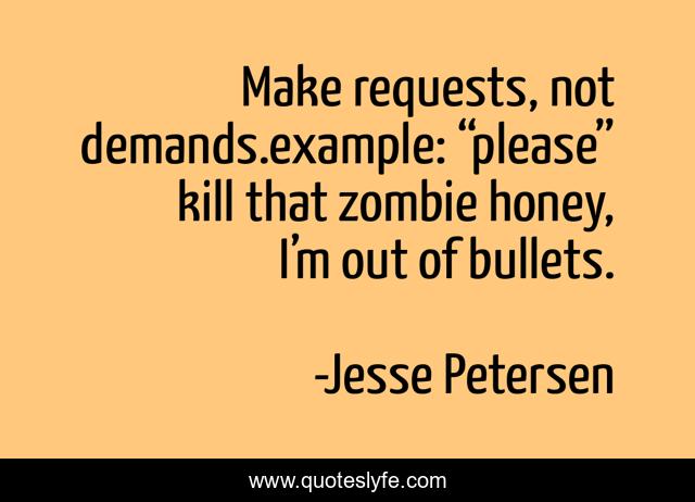 This page presents the quote "Make requests, not demands.example: “please” kill that zombie honey, I’m out of bullets.". Author of this quote is Jesse Petersen. This quote is about humorous, zombie-apocalypse,.