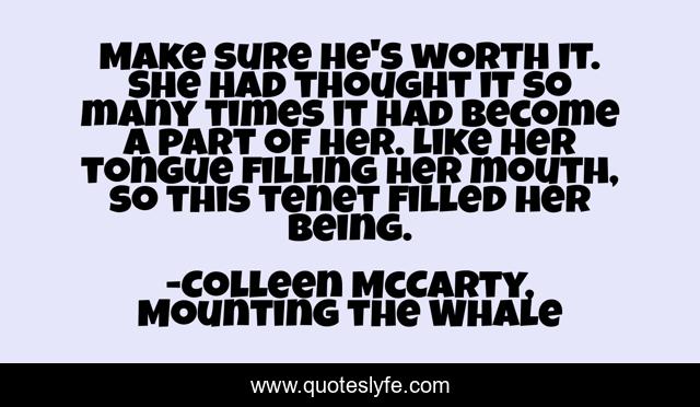 This page presents the quote "Make sure he's worth it. She had thought it so many times it had become a part of her. Like her tongue filling her mouth, so this tenet filled her being.". Author of this quote is Colleen McCarty, Mounting the Whale. This quote is about relationships, finding-the-right-guy, love, worth-it, fiction, good-relationship, books, in-love, affection,.