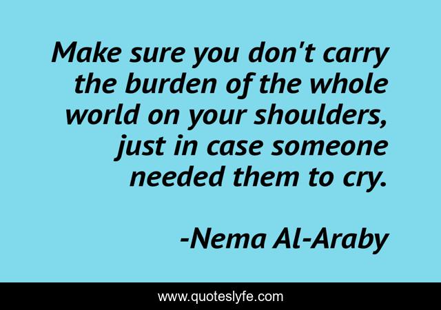 This page presents the quote "Make sure you don't carry the burden of the whole world on your shoulders, just in case someone needed them to cry.". Author of this quote is Nema Al-Araby. This quote is about shoulder, world, burdens,.