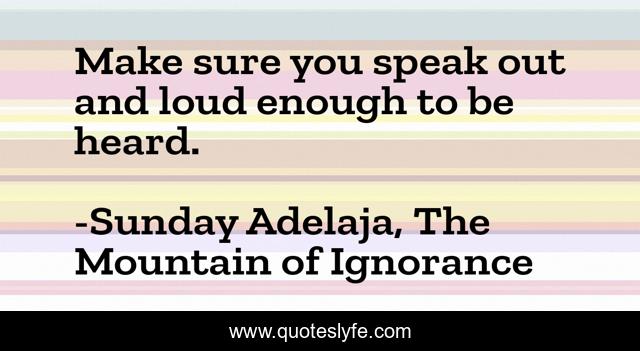 This page presents the quote "Make sure you speak out and loud enough to be heard.". Author of this quote is Sunday Adelaja, The Mountain of Ignorance. This quote is about mountain, life, darkness, power, danger, speak-out, god, people, ignorance,.