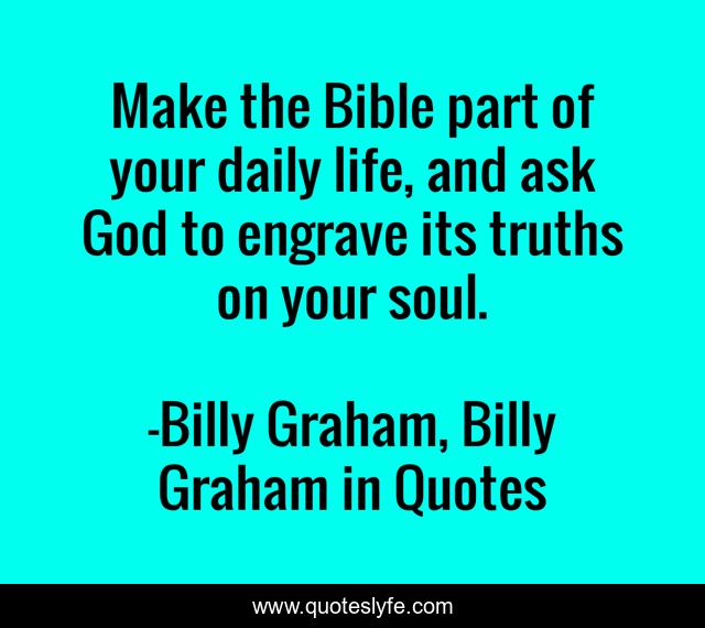 This page presents the quote "Make the Bible part of your daily life, and ask God to engrave its truths on your soul.". Author of this quote is Billy Graham, Billy Graham in Quotes. This quote is about bible, billy-graham,.