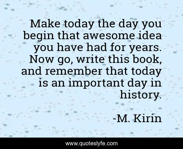 This page presents the quote "Make today the day you begin that awesome idea you have had for years. Now go, write this book, and remember that today is an important day in history.". Author of this quote is M. Kirin. This quote is about writers-on-writing, writer-inspiration, writing-advice, inspiration, writing,.