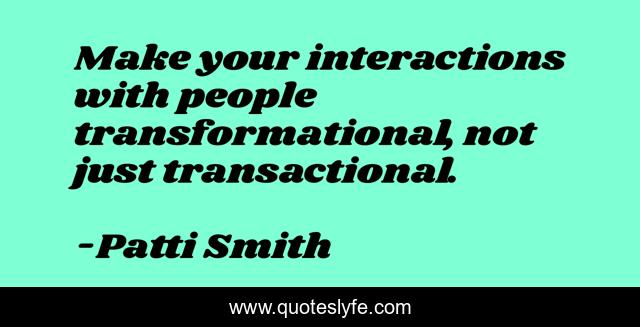This page presents the quote "Make your interactions with people transformational, not just transactional.". Author of this quote is Patti Smith. This quote is about 37-days, inspirational, enthusiasm,.