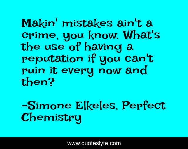 This page presents the quote "Makin' mistakes ain't a crime, you know. What's the use of having a reputation if you can't ruin it every now and then?". Author of this quote is Simone Elkeles, Perfect Chemistry. This quote is about mistakes, reputation,.