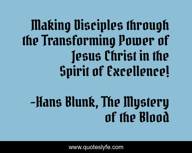 This page presents the quote "Making Disciples through the Transforming Power of Jesus Christ in the Spirit of Excellence!". Author of this quote is Hans Blunk, The Mystery of the Blood. This quote is about salvation, blood, prison,.