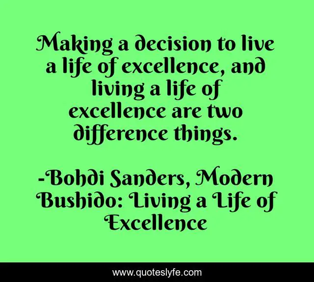 This page presents the quote "Making a decision to live a life of excellence, and living a life of excellence are two difference things.". Author of this quote is Bohdi Sanders, Modern Bushido: Living a Life of Excellence. This quote is about life, life-and-living, excellence, bohdi-sanders,.