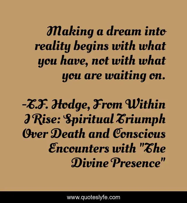 "T.F. Hodge, From Within I Rise: Spiritual Triumph Over Death and Conscious Encounters with "The Divine Presence" Quotes." Quoteslyfe.com, 2025. Sat. 06 Dec. 2025. <https://www.quoteslyfe.com/quote/Making-a-dream-into-reality-begins-with-22154>.