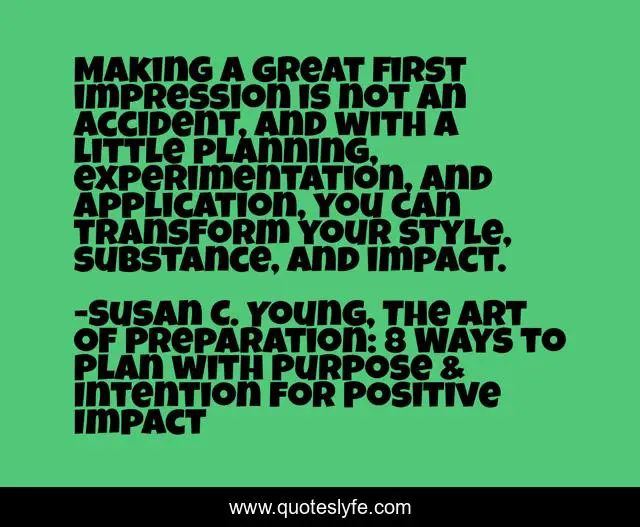 "Susan C. Young, The Art of Preparation: 8 Ways to Plan with Purpose & Intention for Positive Impact Quotes." Quoteslyfe.com, 2025. Fri. 05 Dec. 2025. <https://www.quoteslyfe.com/quote/Making-a-great-first-impression-is-not-227477>.