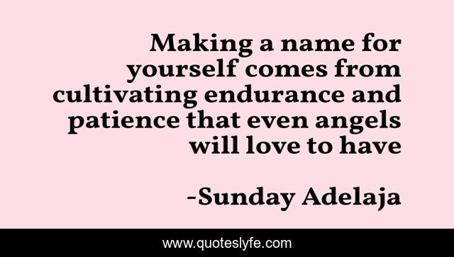 This page presents the quote "Making a name for yourself comes from cultivating endurance and patience that even angels will love to have". Author of this quote is Sunday Adelaja. This quote is about life, love, hard-work, people, fact, endurance, famous, calling, patience,.