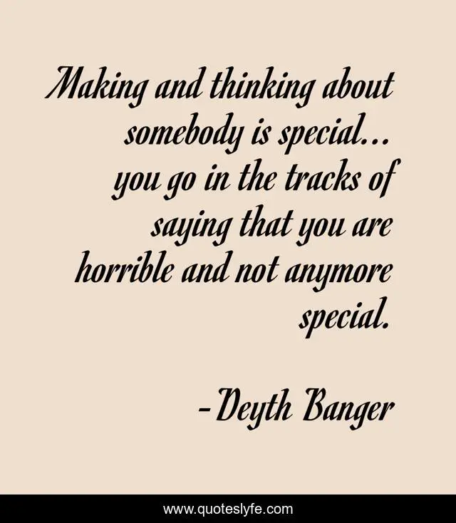 This page presents the quote "Making and thinking about somebody is special... you go in the tracks of saying that you are horrible and not anymore special.". Author of this quote is Deyth Banger. This quote is about thinking, making, tracks, special, horrible,.