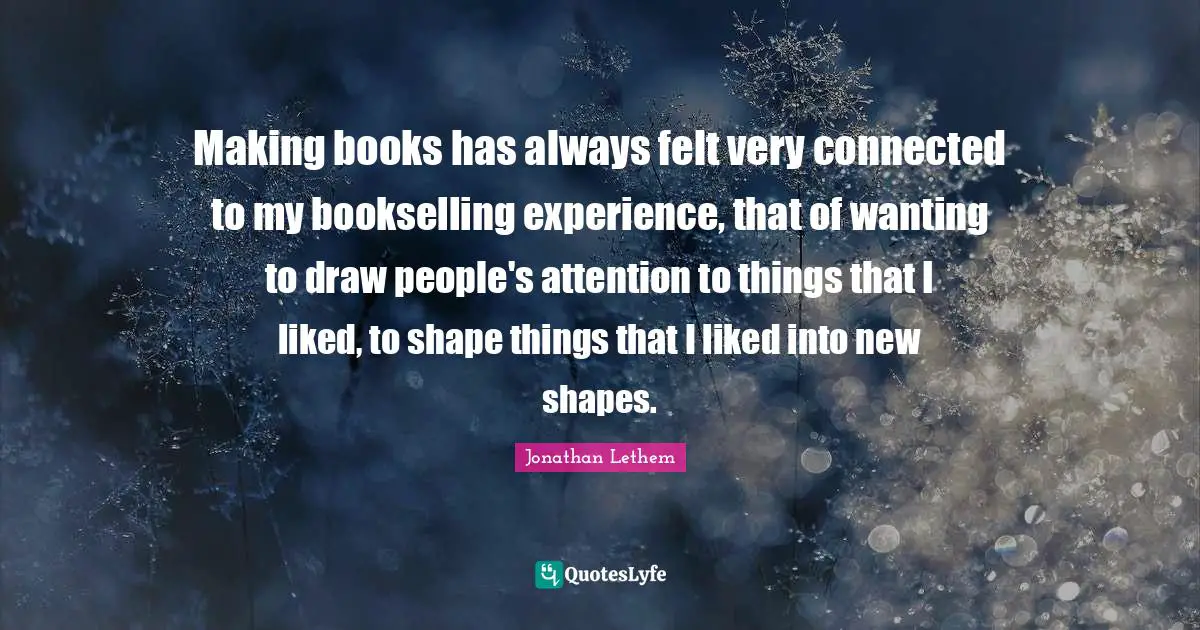 This page presents the quote "Making books has always felt very connected to my bookselling experience, that of wanting to draw people's attention to things that I liked, to shape things that I liked into new shapes.". Author of this quote is Jonathan Lethem. This quote is about attention, connected, people, shapes, felt, book, experience,.