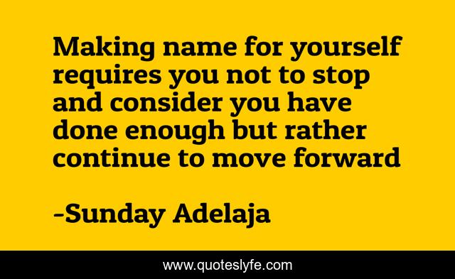 This page presents the quote "Making name for yourself requires you not to stop and consider you have done enough but rather continue to move forward". Author of this quote is Sunday Adelaja. This quote is about life, hard-work, people, calling, famous, purpose, truth, fame, relentless,.