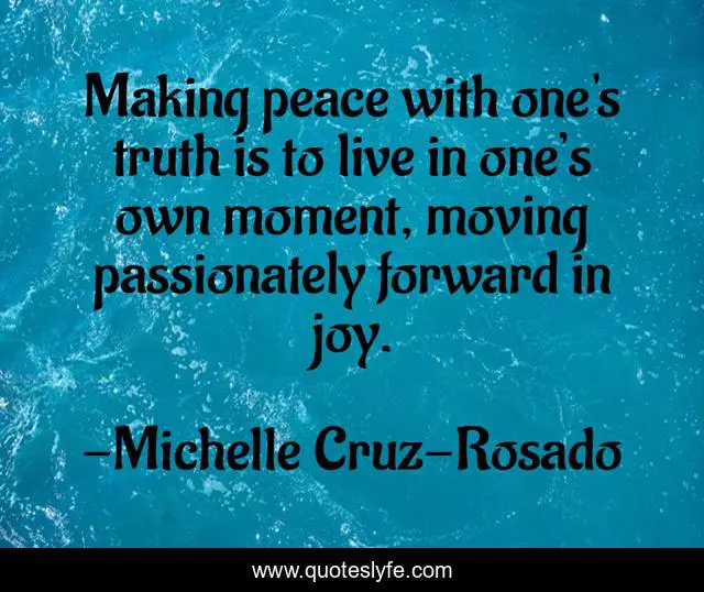 This page presents the quote "Making peace with one's truth is to live in one’s own moment, moving passionately forward in joy.". Author of this quote is Michelle Cruz-Rosado. This quote is about peace-of-mind, spiritual-growth, inspirational, enthusiasm,.