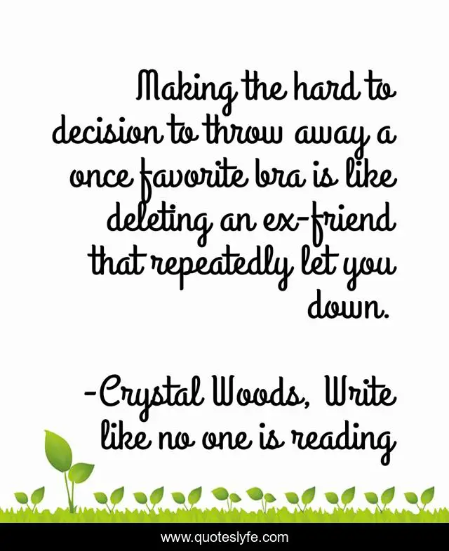This page presents the quote "Making the hard to decision to throw away a once favorite bra is like deleting an ex-friend that repeatedly let you down.". Author of this quote is Crystal Woods, Write like no one is reading. This quote is about favorite-bra, let-down, disappointment, bad-friend, ex-friends, decisions, bra,.