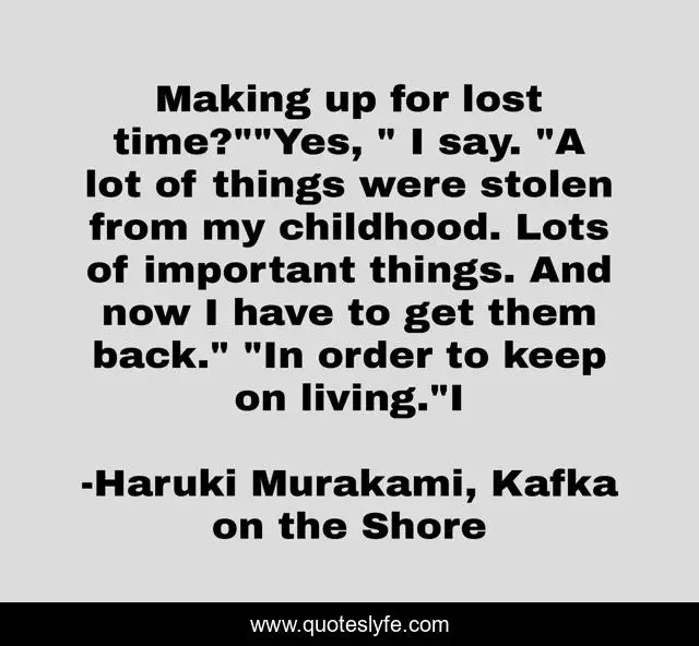 This page presents the quote "Making up for lost time?""Yes, " I say. "A lot of things were stolen from my childhood. Lots of important things. And now I have to get them back." "In order to keep on living."I". Author of this quote is Haruki Murakami, Kafka on the Shore. This quote is about life, childhood, time,.